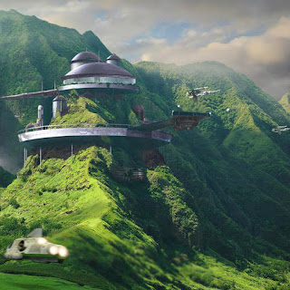 Afara, privesc nenatural, inmarmurita, un peisaj apocaliptic. Suntem undeva foarte sus, untr-o cladire ce pare sa leviteze deasupra unei planete noi, altfel, alta decat Pamantul. Campuri cu relief perfect desenat, terasat milimetric, acoperite cu gazon taiat impecabil, se intind cat pot cuprinde vizual. In mod bizar, imi aminteste de o priveliste de depresiune, care se intinde sub priviri de undeva dintr-un anume loc, pe Transfagarasan. Ce lipseste in mod clar e soarele. Pe cer, in jur, e plin de stele si planete mai mari sau mai mici, dimensionate asa probabil din cauza distantei. Inteleg c-am plecat demult de pe Pamant, caci acolo se stinsese soarele.